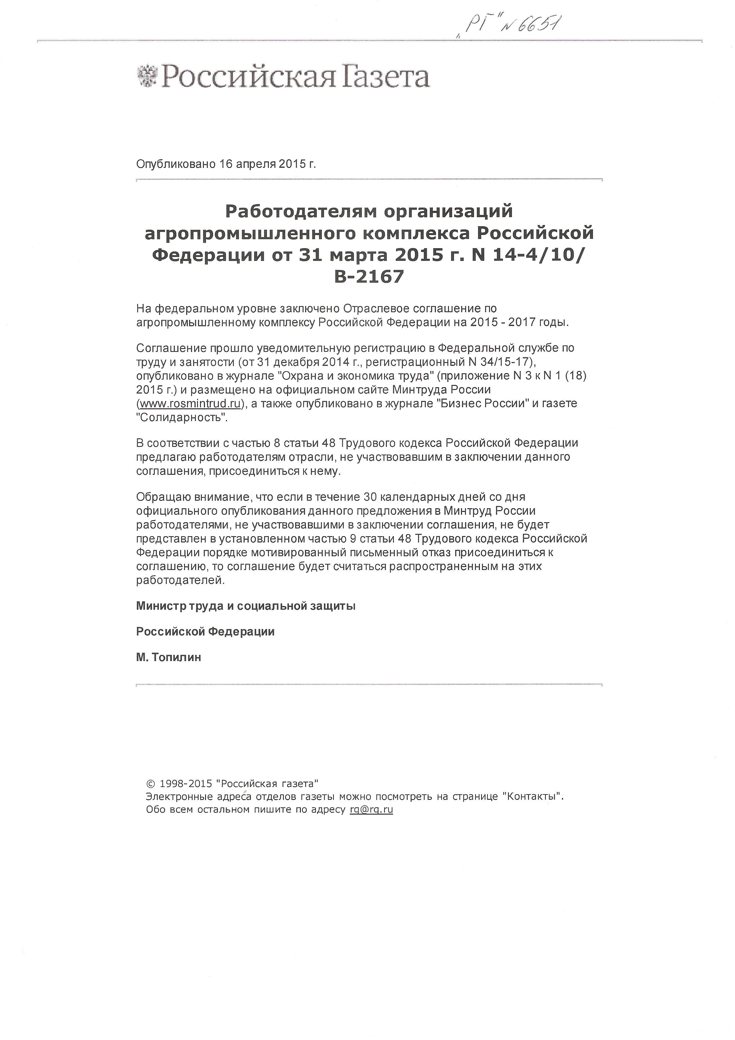 1 января 2015 года вступило в силу Отраслевое соглашение по агропромышленному комплексу Российской Федерации на 2015-2017 годы, зарегистрированное в установленном порядке Федеральной службой по труду и занятости 31 декабря 2014 года, регистрационный номер 34/15-17.
