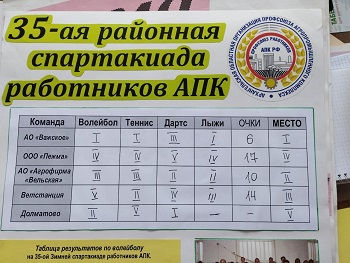В соревнованиях участвовали 5 команд предприятий Вельского района: АО «Важское»; ООО «Пежма»; ГБУАО «Вельская райСББЖ»; АО «Агрофирма Вельская»; команда с. Долматово. Соревнования проходили по 4 видам спорта: лыжные гонки, волейбол,настольный теннис, дартс. В нелегкой борьбе, в общем зачете первое место заняла команда АО «Важское».