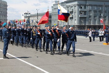 Центральным событием праздника стало торжественное построение и парад военной техники. Чеканя шаг, курсанты челябинского филиала Военно-воздушной академии внесли на площадь Революции Знамя Победы и Государственный флаг Российской Федерации. За ними – барабанщики Кадетского корпуса имени Александра Невского школы №45 Челябинска. Реконструированные взводы в форме времен Великой Отечественной войны несли алые полотнища, на которых золотом вытканы названия легендарных фронтов, сформированных на территории Южного Урала. По площади также прошел реконструтрованный взвод специалистов-кинологов со служебными собаками. Всего возле трибун с ветеранами и родственниками героев ВОВ прошло около 2,5 тыс. человек – это расчеты авиационного городка, колонны регионального полицейского Главка и ГУФСИН, пограничного управления, МЧС, курсанты военного факультета Южно-Уральского государственного факультета. «Гвоздем программы» стал показ боевой техники: челябинцы увидели самоходую артиллерийскую установку ИСУ-152, тяжелые армейские мотоциклы с коляской марки М-72; бронеавтомобили, бронетранспортеры, ГАЗы с пушками и ЗИЛы. В небе пролетели самолеты из челябинского аэроклуба.