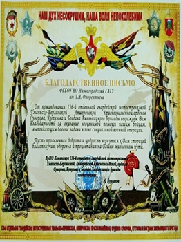 На заседании ректората в торжественной обстановке председатель Нижегородской областной организации Профсоюза Светлана Игоревна Олонина вручила Благодарственное Письмо от командования 136-й отдельной гвардейской мотострелковой Уманьско-Берлинской, Апшеронской Краснознаменной, орденов Суворова, Кутузова и Богдана Хмельницкого бригады и.о.ректора Нижегородского ГАТУ Г.В.Жданкину за оказание гуманитарной помощи бойцам, находящимся в зоне СВО.
