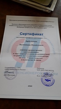 В рамках программы информационного взаимодействия профсоюзных организаций Приморской краевой организации Профсоюза на 2021-2025 годы председатель комиссии по информационной работе Валентина Михайловна Куделькина с 03.04.2021 года по 31.05.2021 г. прошла обучение работе на планшетных компьютерах/смартфонах в Учебном центре профсоюзов Приморского края по социальной программе «Связь поколений».