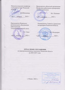 20 января 2025 года подписано Отраслевое соглашение по агропромышленному комплексу Рязанской области на 2025-2027 годы между Министерством сельского хозяйства и продовольствия Рязанской области, Рязанской областной организацией Профсоюза, Рязанским региональным объединением работодателей «Агропромышленный союз», Главным управлением ветеринарии Рязанской области.Отраслевое соглашение, регулирующее социально-трудовые и связанные с ними экономические отношения в агропромышленном комплексе региона, направлено на повышение эффективности работы организаций АПК, соблюдение трудовых прав и законных интересов работников отрасли.